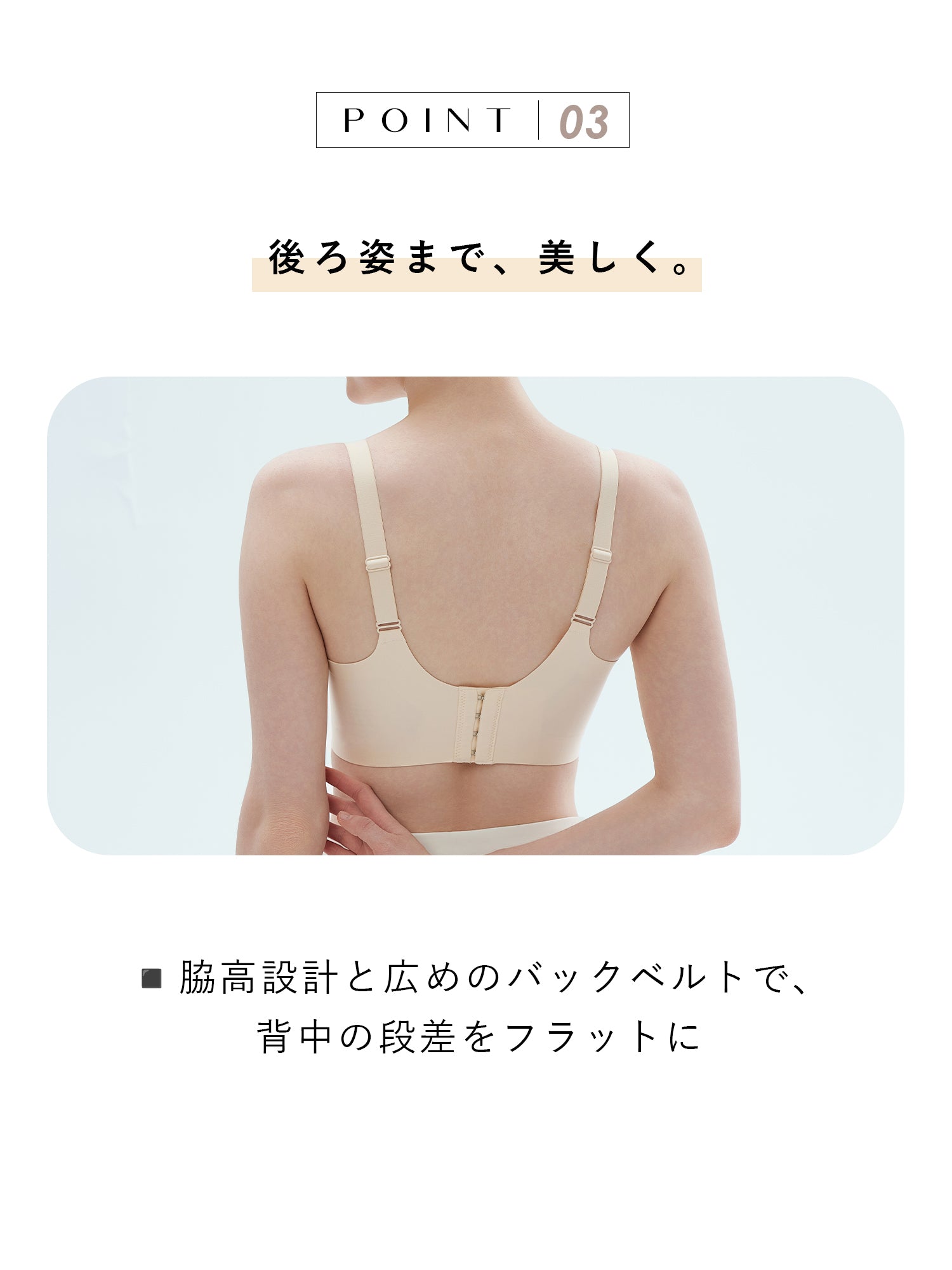 脇高設計と広めのバックベルトで、背中の段差をフラットに。