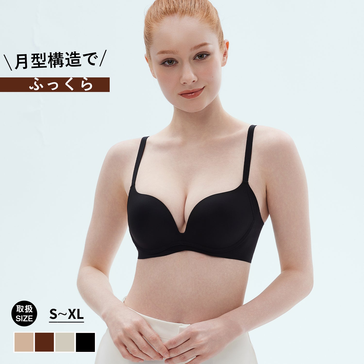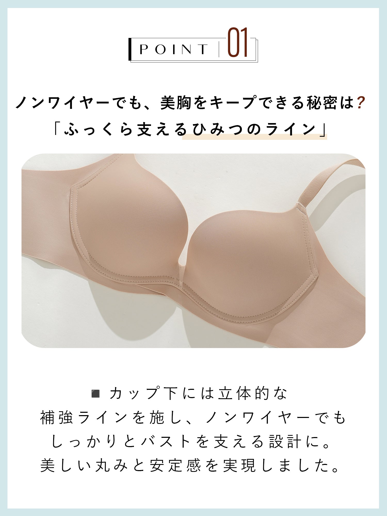 浮いたような月型パッドが、バストの下から支えてフィット感アップ。ズレにくく、美しいシルエットをキープ。